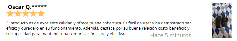 El producto es de excelente calidad y ofrece buena cobertura. Es fácil de usar y ha demostrado ser eficaz y duradero en su funcionamiento. Además, destaca por su buena relación costo beneficio y su capacidad para mantener una comunicación clara y efectiva.